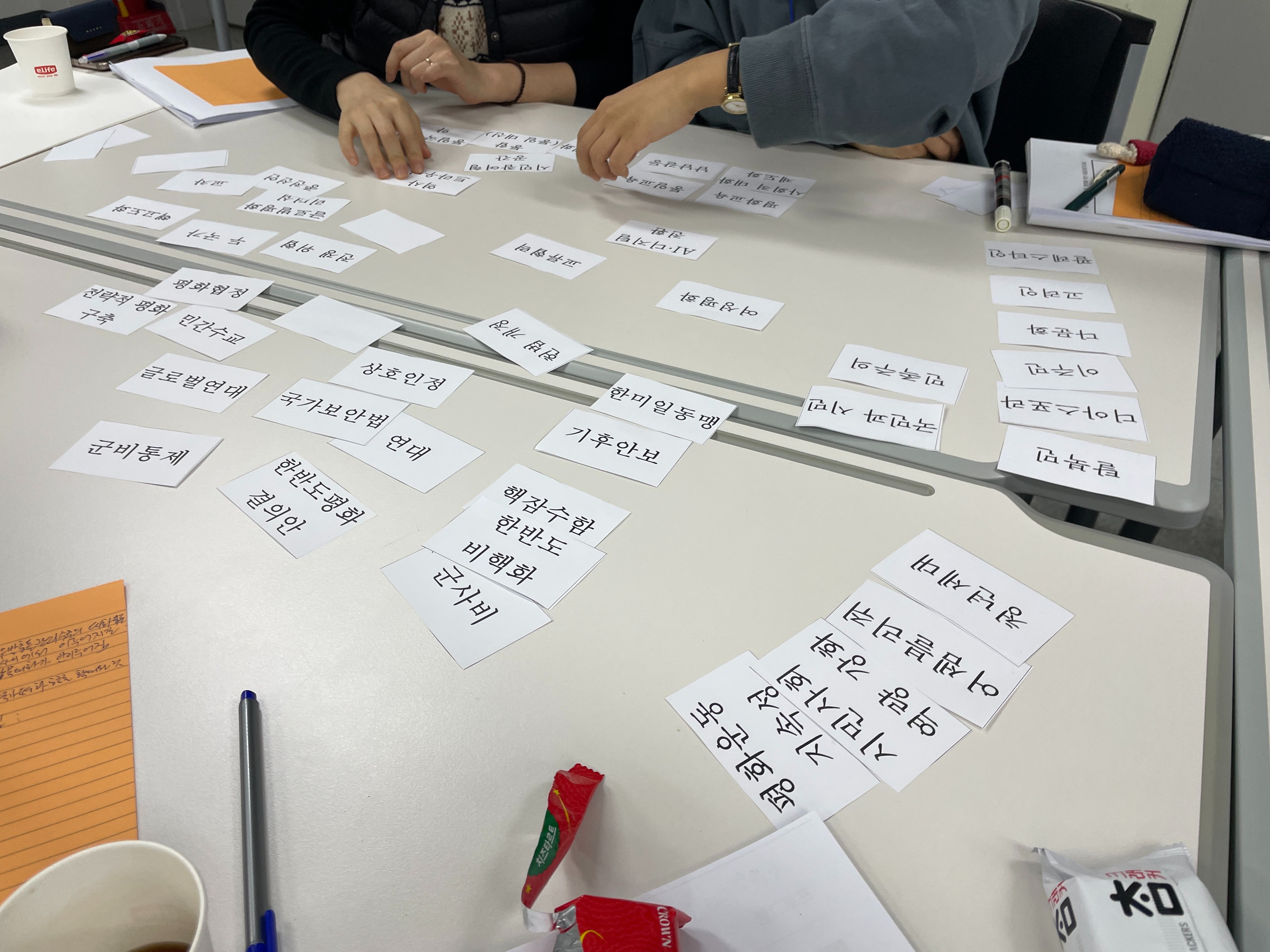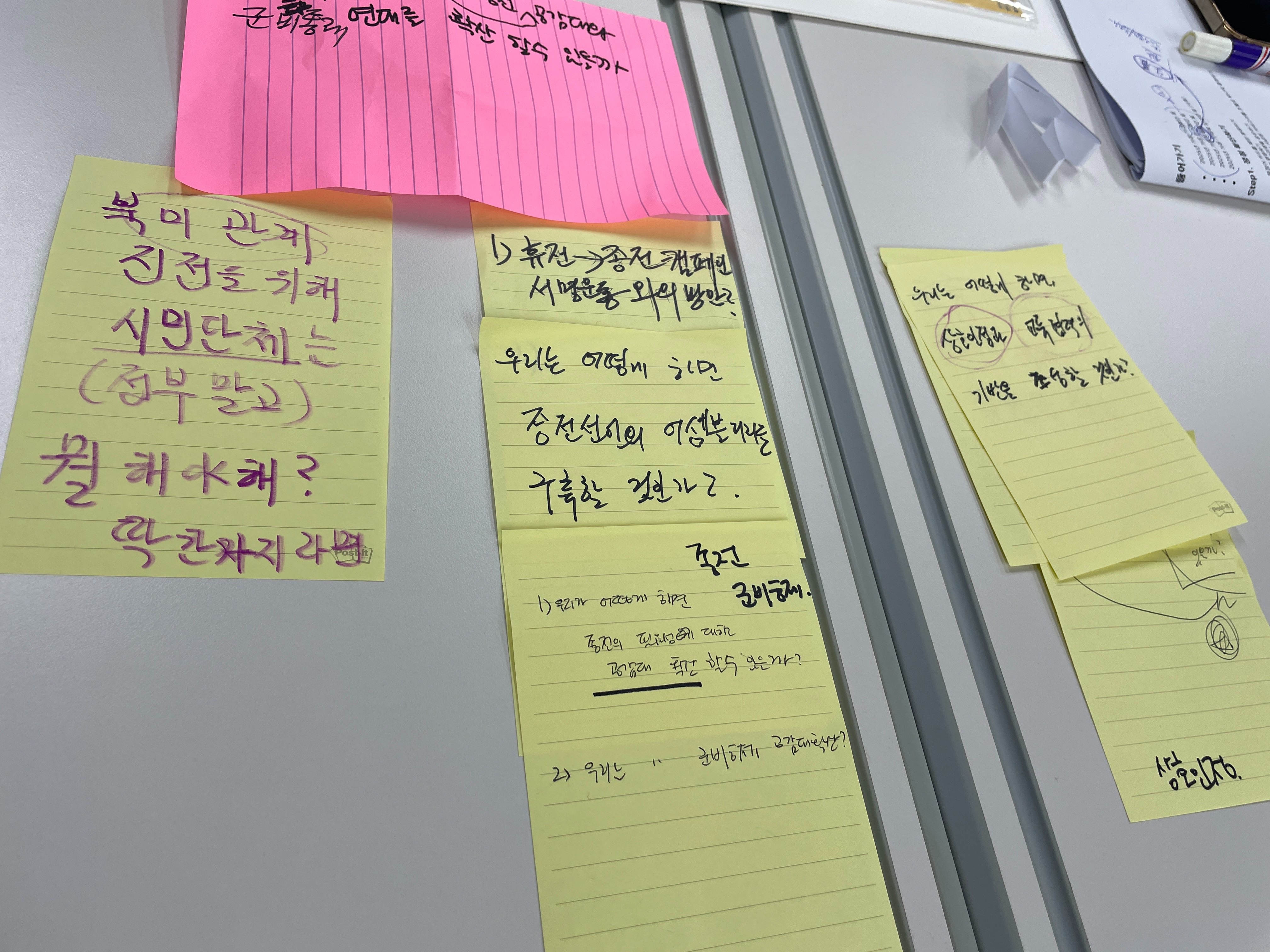 이어진 두 번째 세션에서 참여자들은 다양한 쟁점어 카드를 카테고리별로 분류하고, 가장 중요하거나 시급한 영역을 정해 구체적으로로 액션 플랜을 만드는 워크숍을 진행했습니다. 각 조에서는 ▷적대를 극복하고 상호 신뢰를 높이는 방안 ▷적대적 두 국가를 벗어나 교차승인을 통한 평화체제 구축 ▷전략적 평화체제 구축에 대한 민간 참여 공간 확보 ▷한국전쟁 종식에 대한 공감대 확산 ▷상호인정과 교류협력 기반 조성 ▷국가보안법 폐지 운동의 대중화 ▷영구적 한반도 평화 정착을 위한 헌법 개정 ▷한반도 평화에 대한 국제적 공감대 확보 등을 과제로 설정하고, 행동 전략에 대한 아이디어를 덧붙여나갔습니다. 북한을 공식 국호인 ‘조선’이라 부르자는 제안부터, 분단으로 인해 우리가 잃은 것들을 적극적으로 알리고, 남북기본조약 체결, 사회적 대화를 통한 시민참여 확대, 정책 결정 과정에서 시민사회 참여 요구, 한미연합군사연습과 같은 대북 적대 정책 폐지를 위한 캠페인, 국가보안법 폐해와 사례를 적극 알리자는제안 등이 나왔습니다. 이를 기반으로 각 조에서는 ▷지금 당장 종전! ▷조선이라 부를게 ▷바텀업, 개헌 ▷남북 알고보니.. 등의 시민액션플랜이 구체적으로 만들어졌습니다.